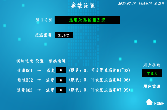 在“参数设置”界面,有“用户登录”和“用户管理”通道,选择用户名、输入对应的密码,可登录系统。